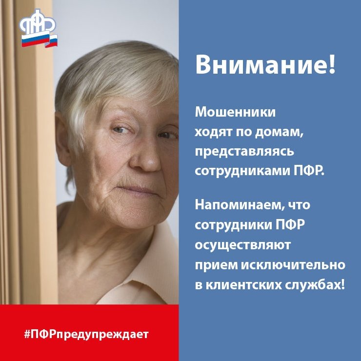 В связи с этим Отделение Пенсионного фонда РФ по Костромской области еще раз настойчиво обращает внимание населения, что сотрудники ПФР по домам не ходят! Все вопросы пенсионного обеспечения решаются только в клиентских службах территориальных органов ПФР.
